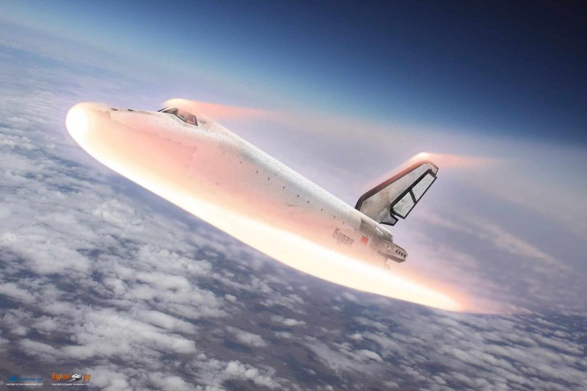 Вход в атмосферу советского орбитального корабля 11Ф35 «Буран» в представлении художника. Источник: «Буран.ру», С. Сергеев.